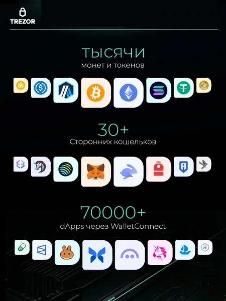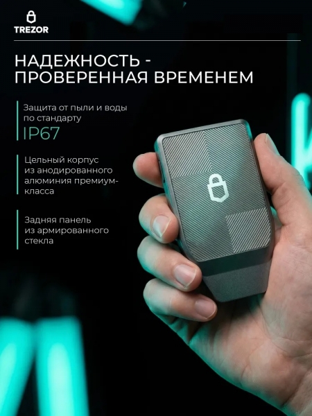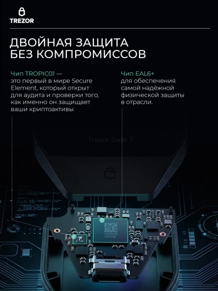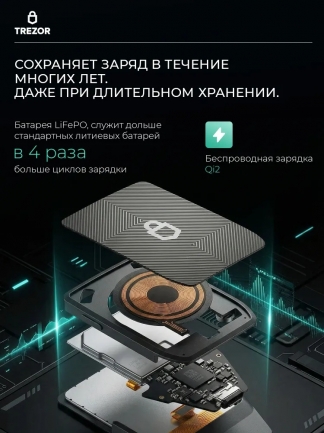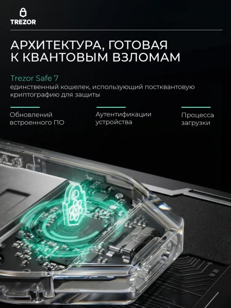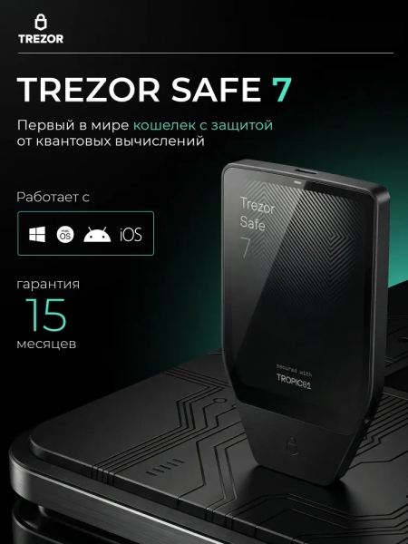 Trezor Safe 7 Charcoal Black — новая модель аппаратного кошелька от компании Trezor, представленная в 2025 году. Это надежный криптокошелек для безопасного хранения и защиты ваших цифровых активов. Устройство выполнено в прочном анодированном алюминиевом корпусе угольно-черного цвета, имеет яркий 2.5-дюймовый цветной дисплей с защитным стеклом Gorilla Glass 3 и удобным сенсорным управлением. Trezor Safe 7 оснащен двумя безопасными чипами: первым в мире открытым Secure Element TROPIC01 и сертифицированным EAL6+, что обеспечивает максимальную безопасность хранения и защиту приватных ключей. Архитектура модели поддерживает quantum-ready обновления, гарантируя пост-квантовую защиту в будущем. Кошелек поддерживает Bitcoin, Ethereum и сотни других криптовалют и токенов. Пользователь может выполнять транзакции, управлять монетами и подключать устройство к компьютеру или мобильному приложению по Bluetooth или через USB-C. LiFePO₄-батарея выдерживает в 4 раза больше циклов зарядки, чем стандартные литиевые батареи. Даже при разряженной батарее устройство остаётся полностью рабочим через USB-C. Поддерживается беспроводная зарядка по стандарту Qi2. Trezor Safe 7 — это холодный кошелек для тех, кто ценит надежную защиту, простоту доступа и современное программное обеспечение для работы с цифровыми активами.