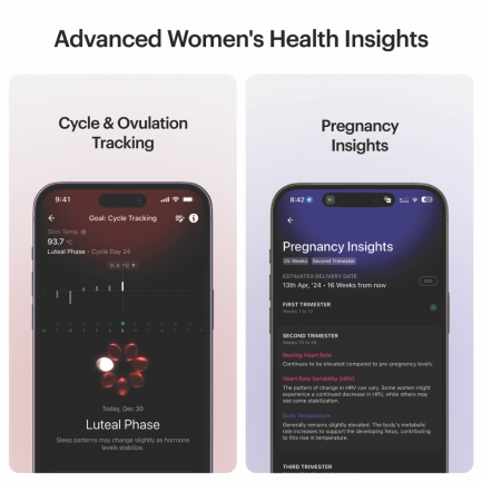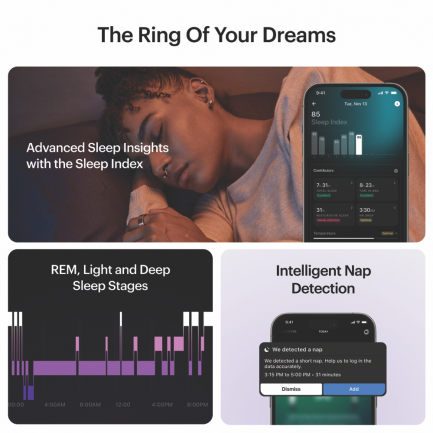 Кольцо обеспечивает непрерывный мониторинг ключевых показателей здоровья, включая сердечный ритм с обнаружением аритмии, качество сна и циркадные ритмы, температуру кожи с медицинской точностью, а также отслеживание физической активности. Уникальные алгоритмы анализируют влияние кофеина на ваш организм и помогают прогнозировать периоды овуляции на основе температурных изменений.